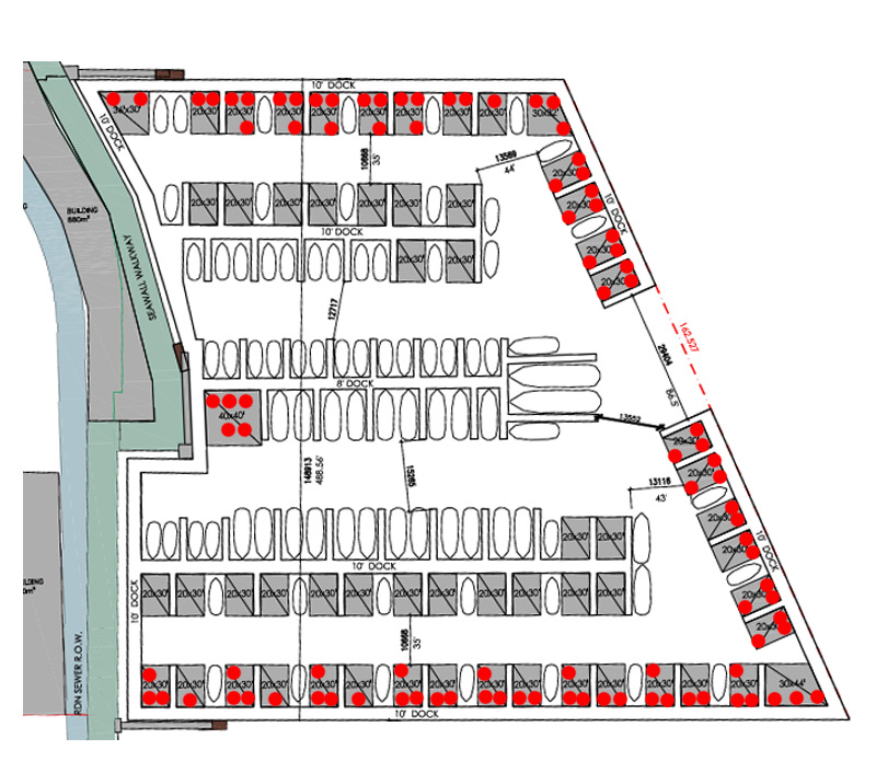 THE FLOAT HOME PROJECT HAS BEEN TERMINATED Sight Views Sizes of the custom float homes will vary from one other. The diagram below will give an idea of how the layout will appear. Note that the outside units will be limited to two stories to preserve the views from various other locations. The 1,600 square foot common building is available for functions for the members of the marina with our administration offices and caretaker's suite above. Please CLICK THE RED DOTS to see the sight views: